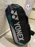 The Yonex Pro Tournament Bag (BAG2401W) is a premium rectangular kit bag designed for professional and club players. It features two spacious main compartments capable of holding up to 6 rackets, apparel, and shuttlecocks. The bag includes a dedicated shoe pocket to keep gear organized and dual carry handles for easy transport. Its durable construction and sleek black design with teal/blue accents make it a stylish choice for tournament travel.